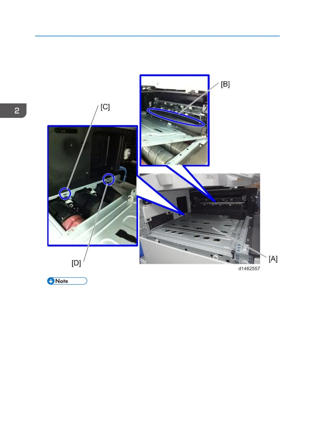 15. While pressing the bottom plate [A] into the area shown by the blue circle [B], insert it