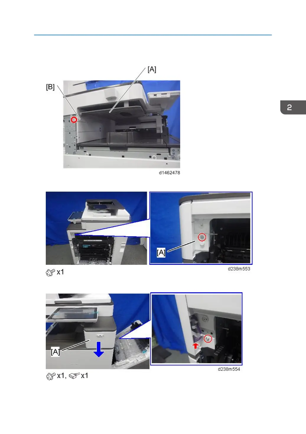 14. Remove the screw and connector, and then remove the front upper cover [A].