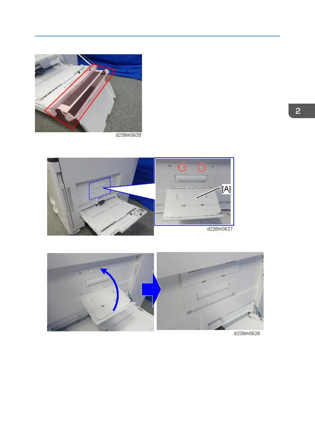 1. Open the bypass tray, and then attach the sub tray [A]. (Rivet x2)