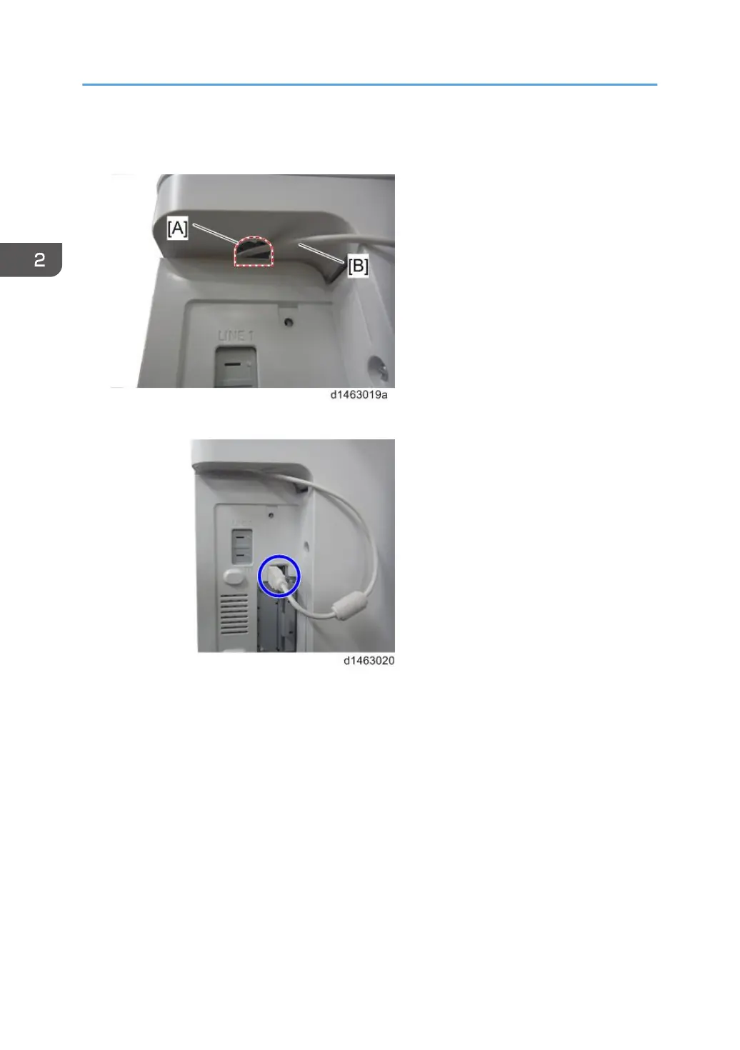 13. Remove the cutout [A] in the left rear cover to make a cable hole, and then pass the