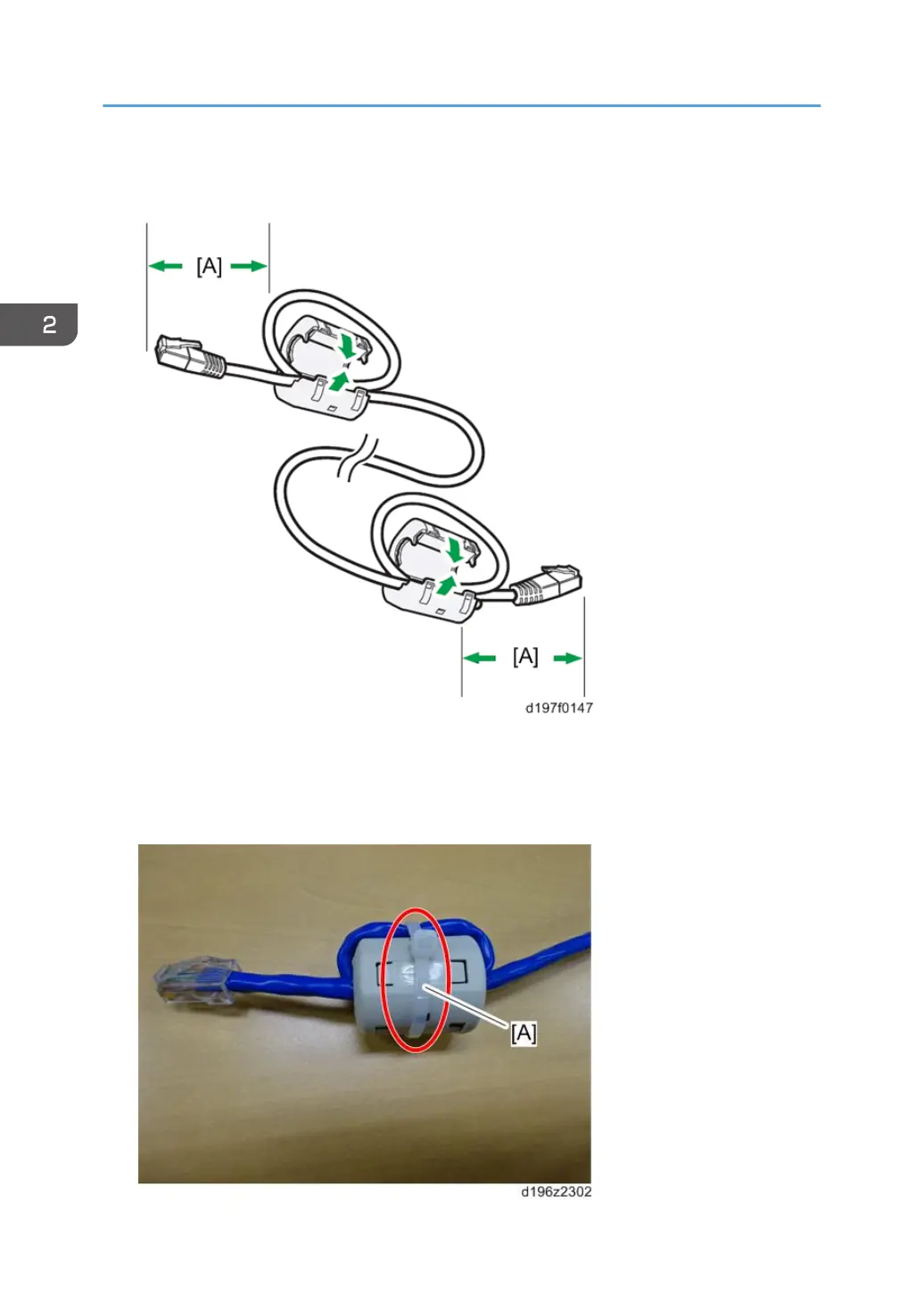 9. Attach the ferrite cores to the Ethernet cable, while looping the cable at 3 cm (approx. 1.2