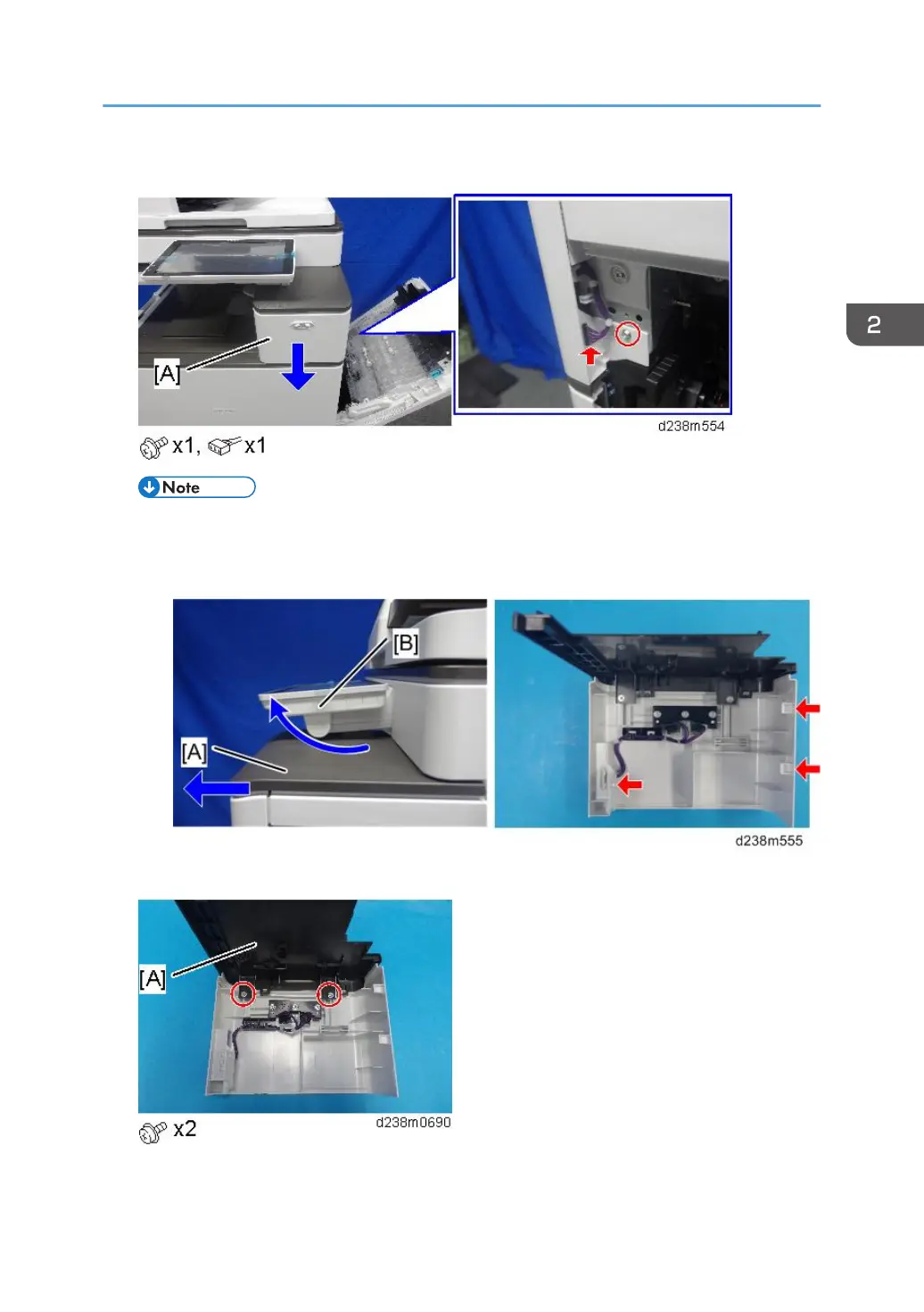 • Rotate the operation panel [B] upward to a horizontal position, and then detach the front