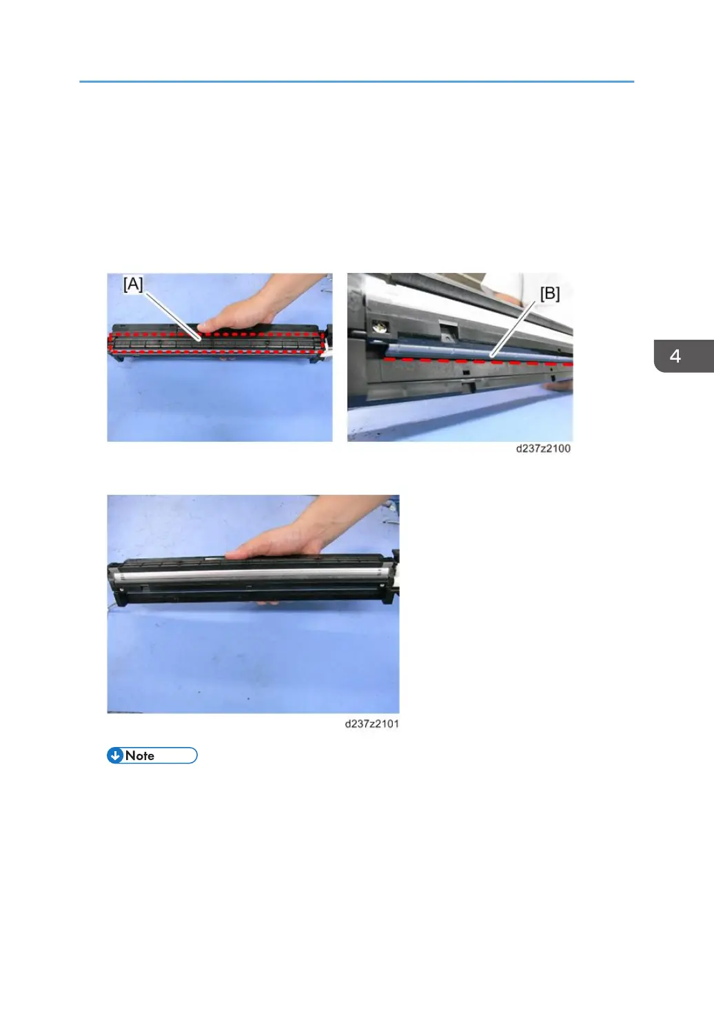 • DO NOT touch the development roller housing [A]. Doing so will deform the development