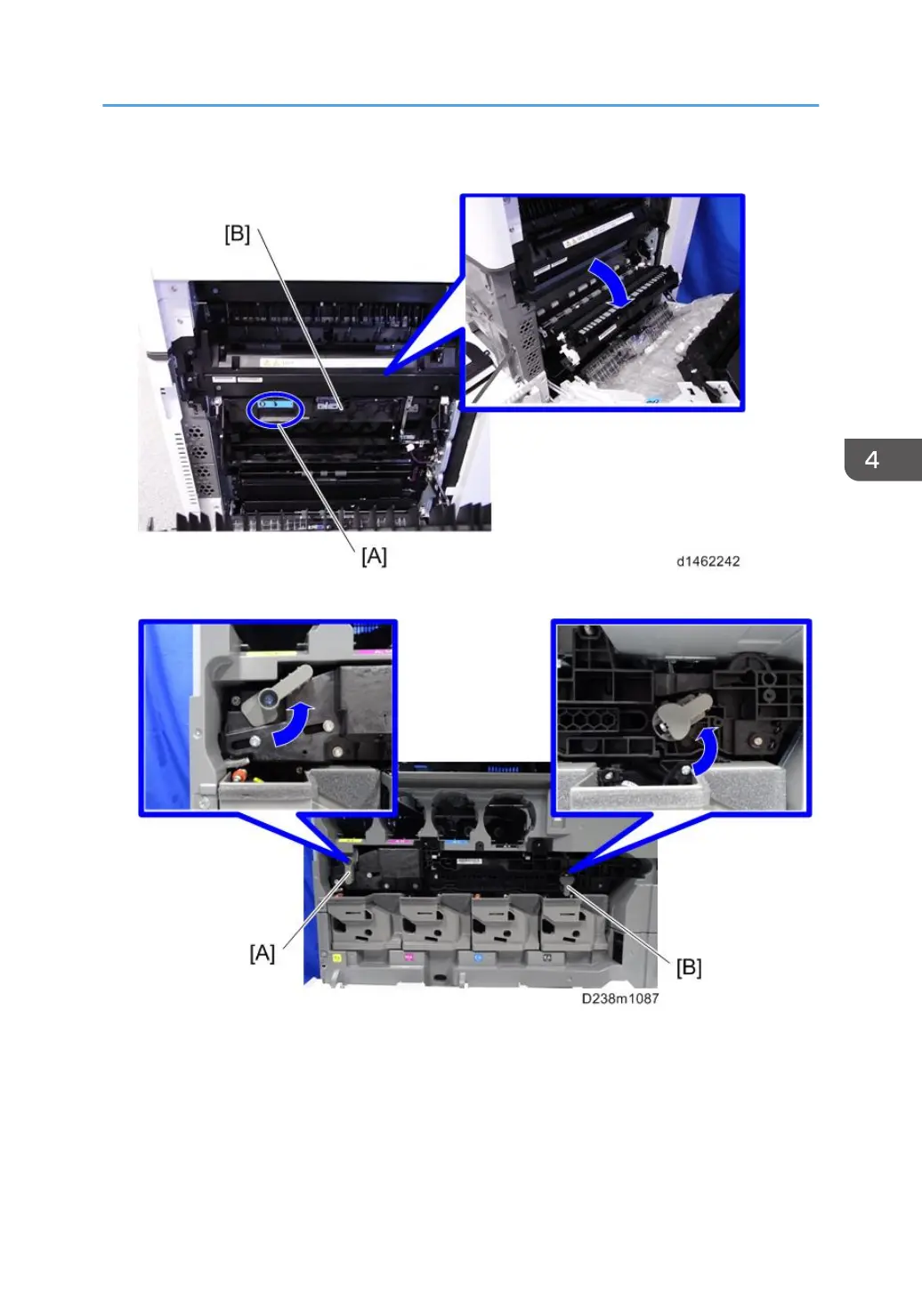 4. Pull the handle [A] and open the paper transfer unit [B].