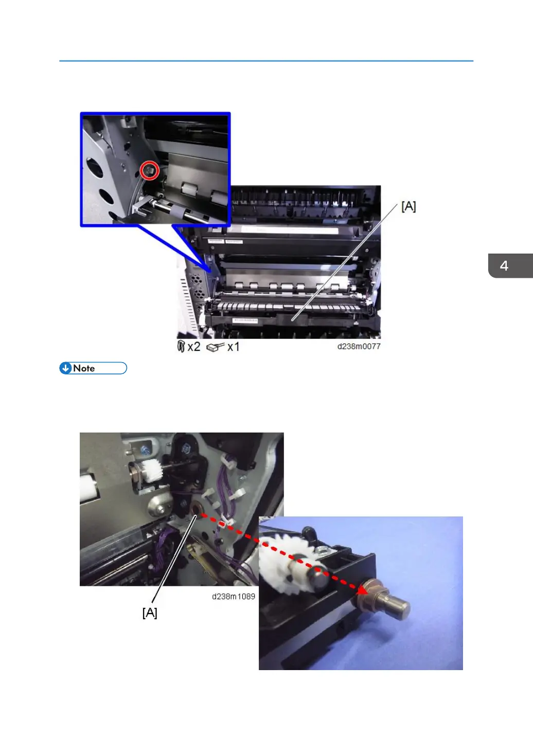 4. Remove the left clip ring at the front side, and remove the paper transfer roller unit [A].