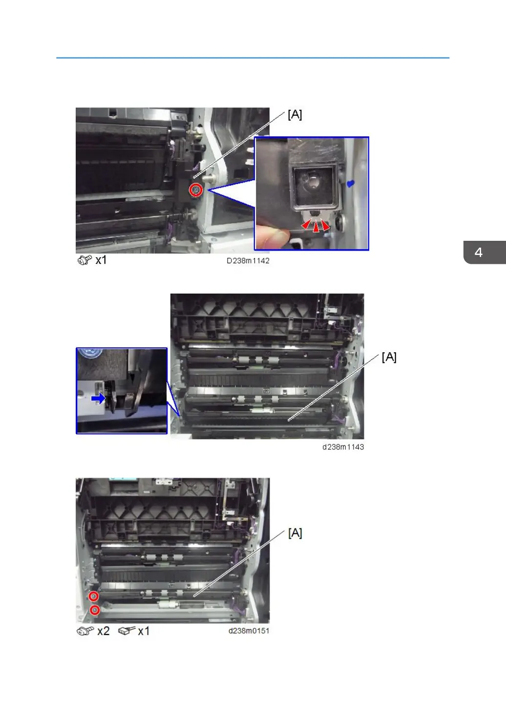 5. Press the left tab to release the lock, and remove the paper feed guide plate [A].