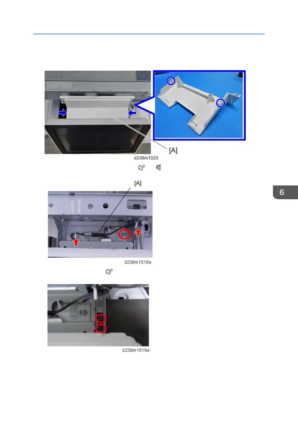 6. Holding down both the sides of the operation panel upper cover [A], unhook the tabs
