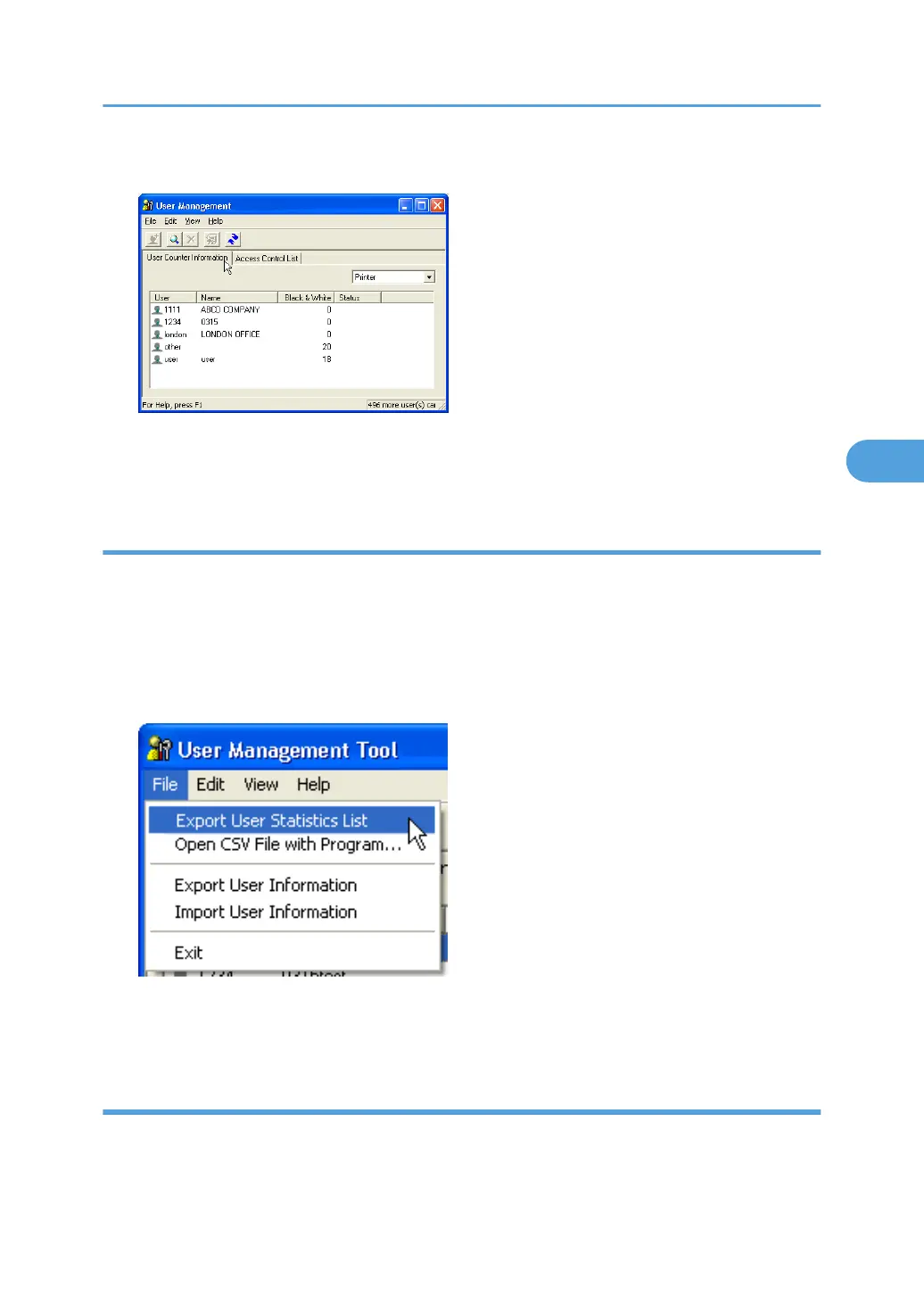 Follow the procedure below to export the information of the number of pages printed under each user as