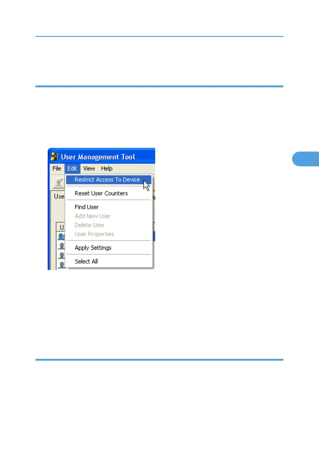 4. On the [Edit] menu of User Management Tool, click [Restrict Access To Device].