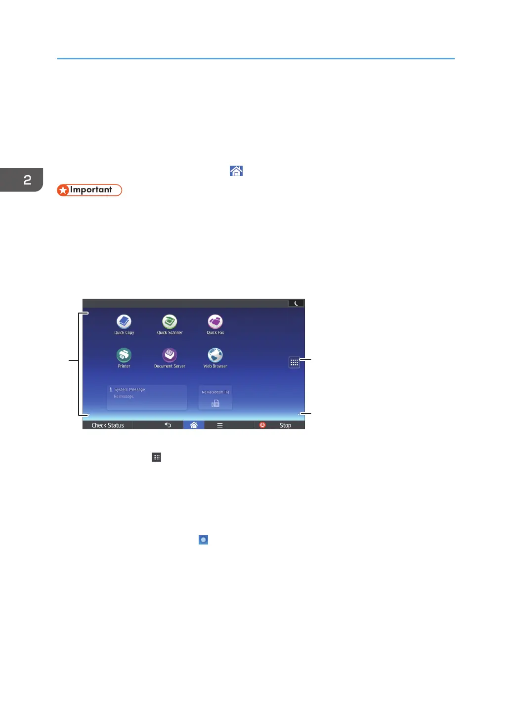 For details about icons on each screen, see "Main Icons on the [Home] Screen", Getting Started.