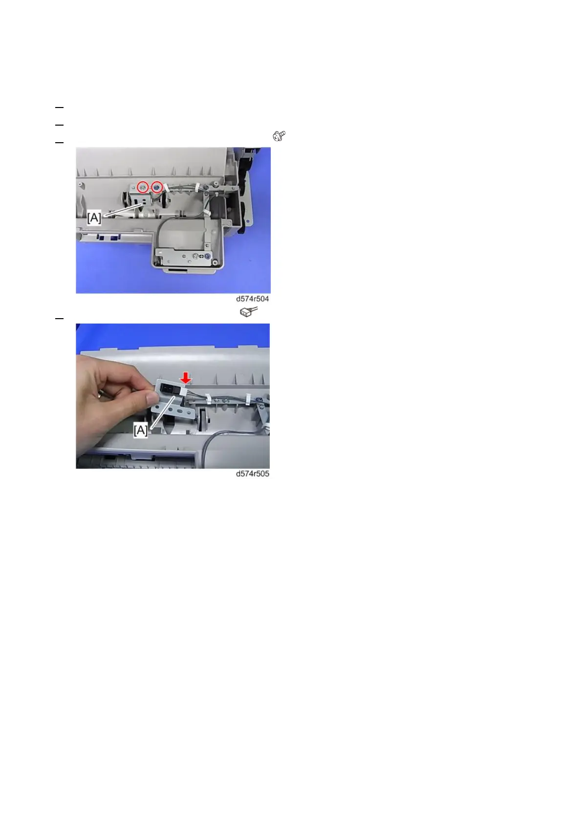 4. Remove the 1-bin tray exit sensor [A]. ( × 1, hooks)