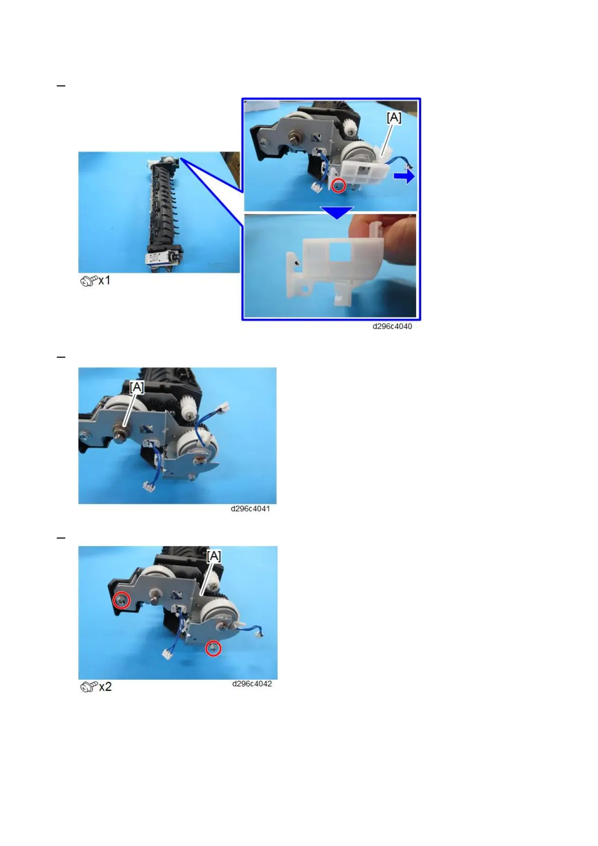 4. Remove the paper exit clutch and reverse clutch with the bracket [A].