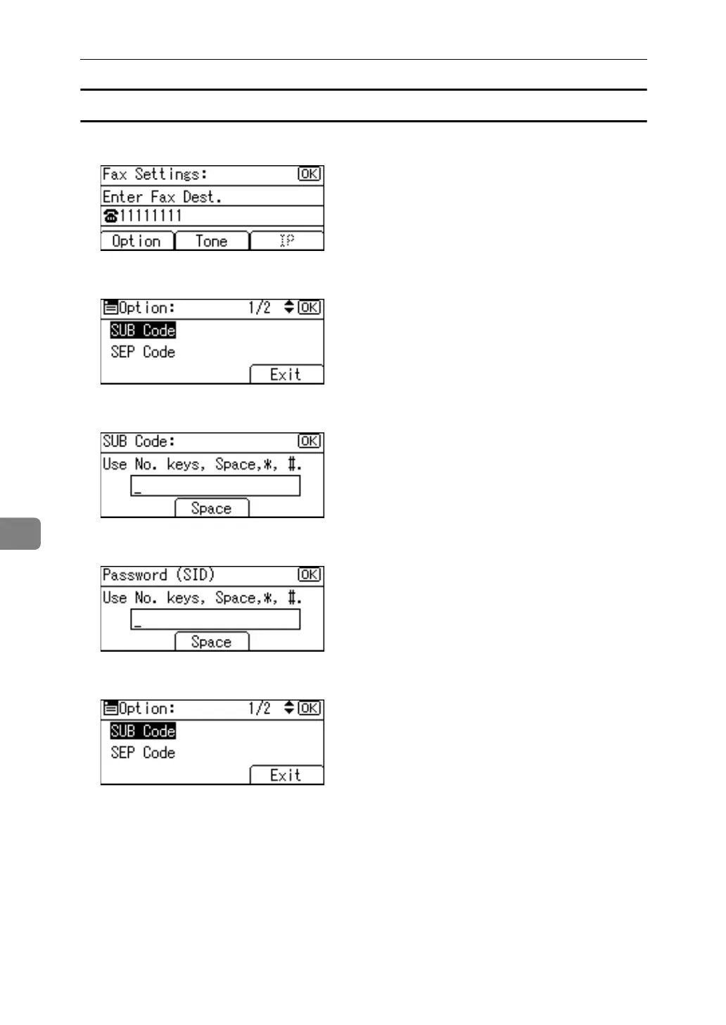 C Enter the SUB Code using the number keys and then press the {OK} key.