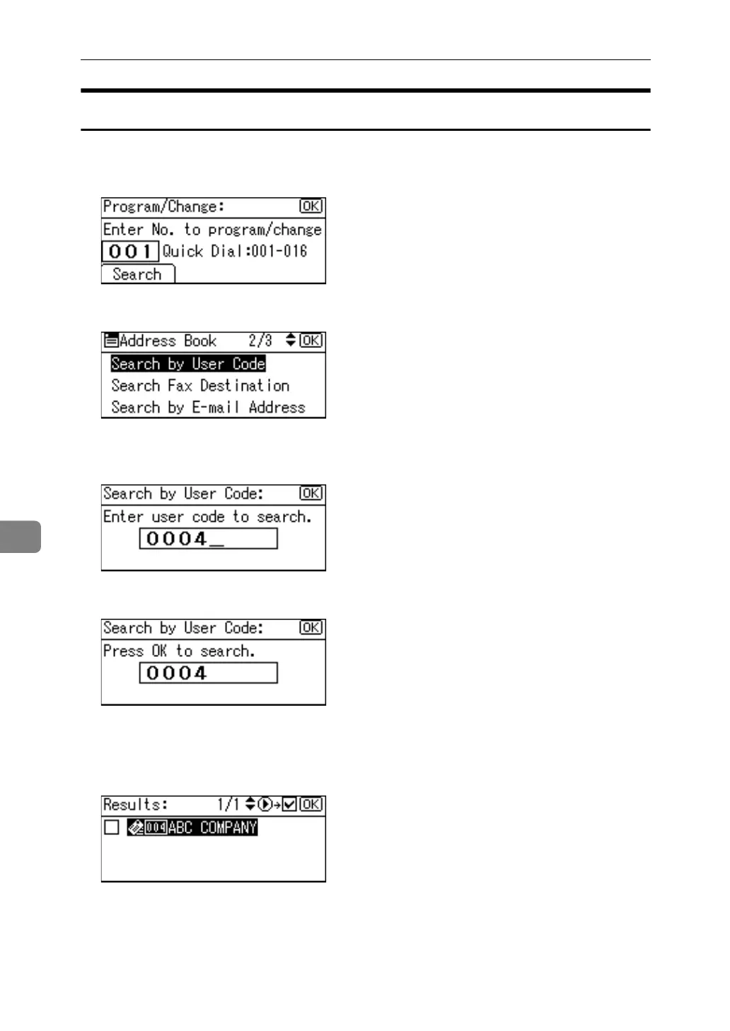 B Select [Search by User Code] using {U} or {T}, and then press the {OK} key.