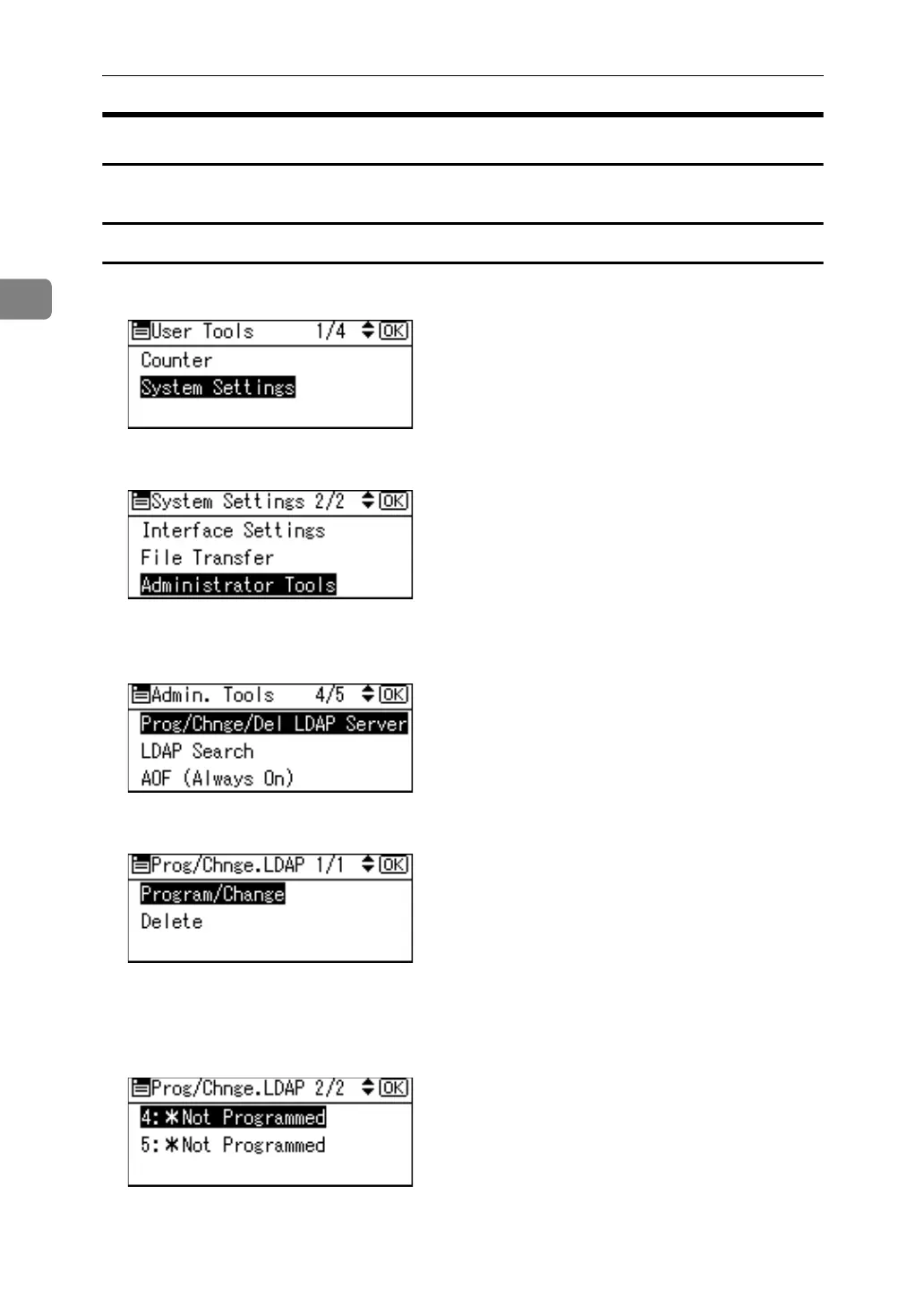C Select [Prog/Chnge/Del LDAP Server] using {U} or {T}, and then press the {OK}