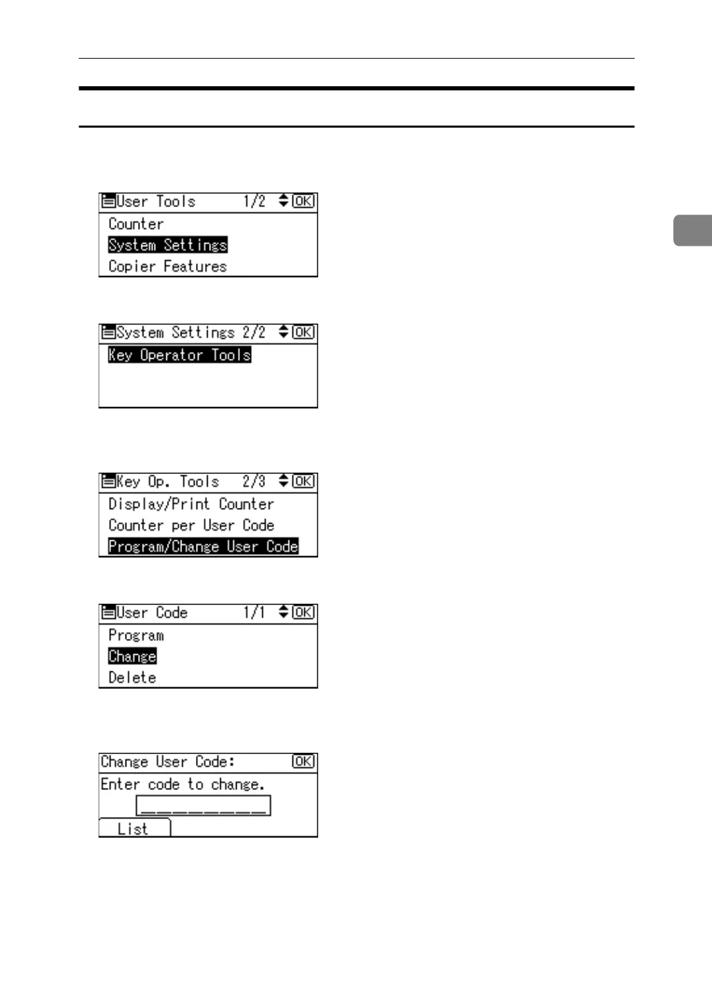 C Select [Program / Change User Code] using {U} or {T}, and then press the {OK}