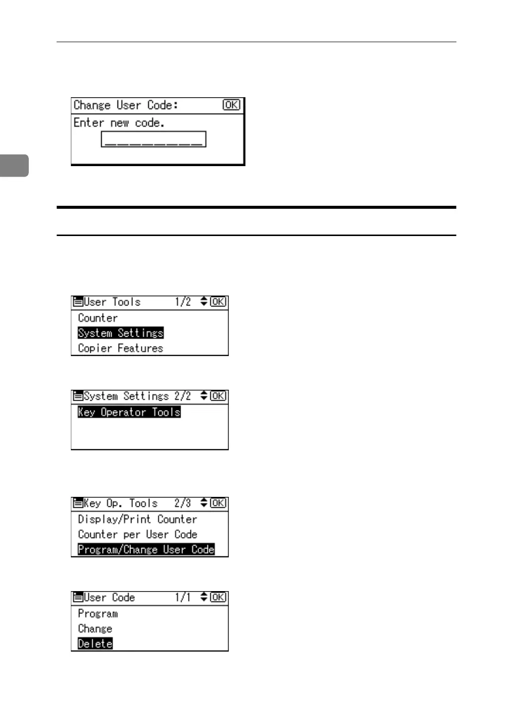 C Select [Program / Change User Code] using {U} or {T}, and then press the {OK}