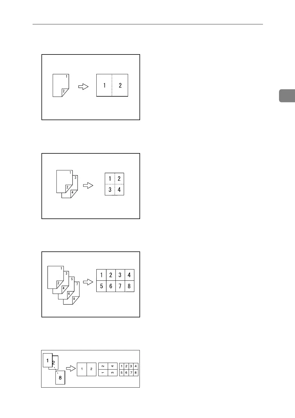 Copies 4 two-sided originals to one side of a sheet.