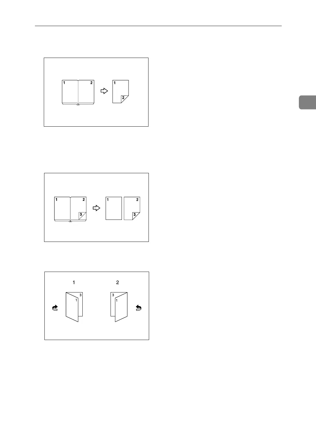 Copies a two-page spread original onto one sheet with one page per side.