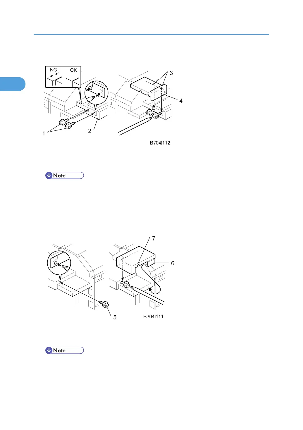 1. Temporarily attach the screws [1] (with about two turns) to the right end of the finisher
