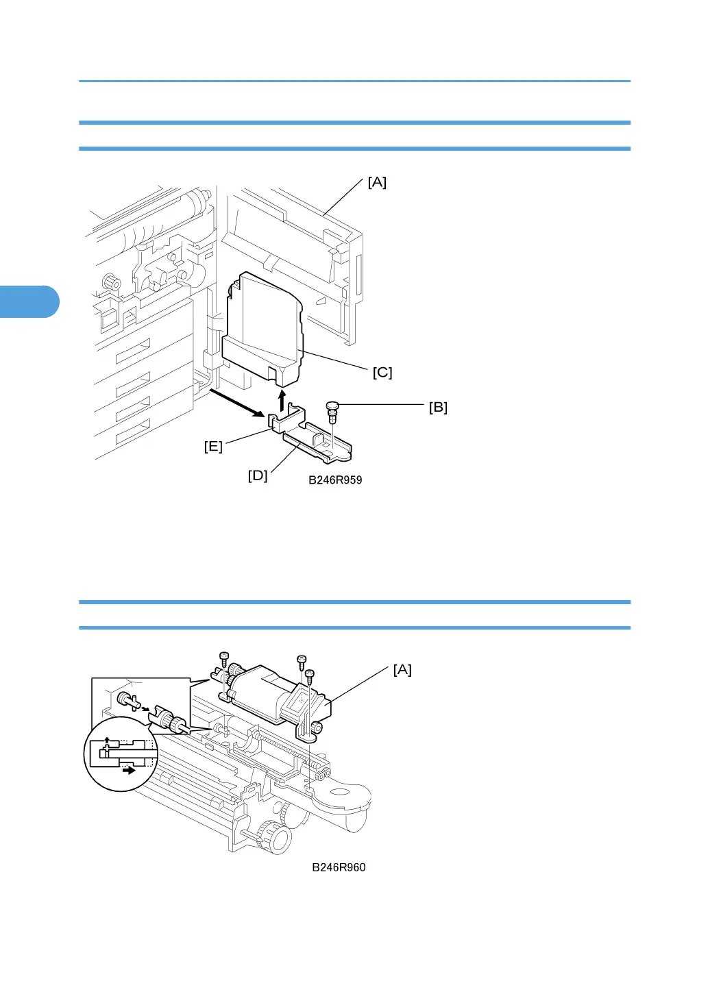 2. Remove the lock pin [B], then pull out the toner collection bottle [C] and its base [D].