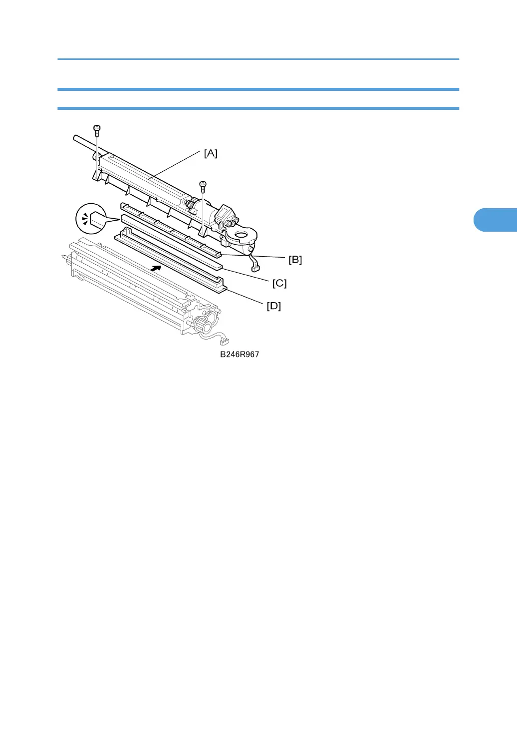 • Make sure that the rails where the development filter bracket [C] connects to the development