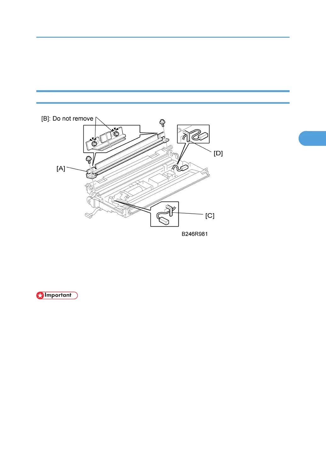 • Never remove the inner lock screws [B] of the transfer roller cleaning blade.