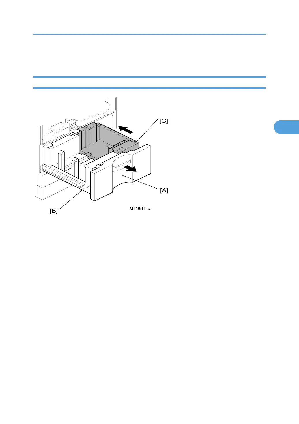 2. Pull out the tandem tray drawer [A] completely to separate the left [B] and right [C] sides