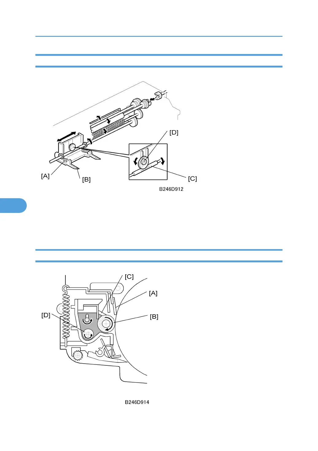 During copying, a shaft [C] turns a cam [D]. The cam moves the pick-off pawls from side to side to prevent