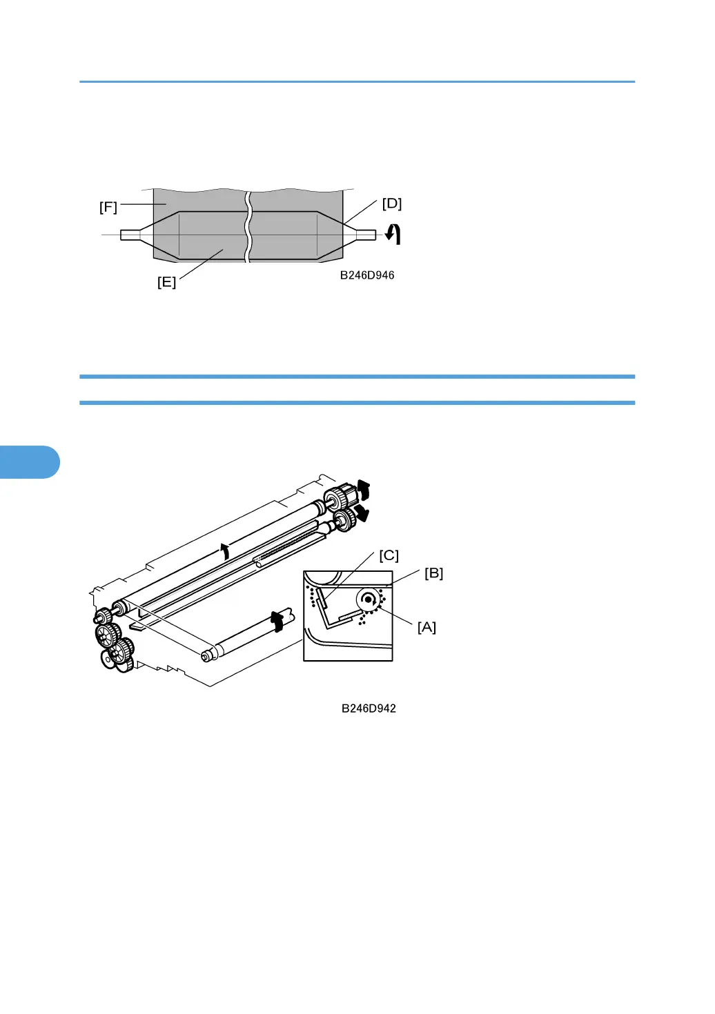 The cleaning blade [C] scrapes toner off the cleaning roller.