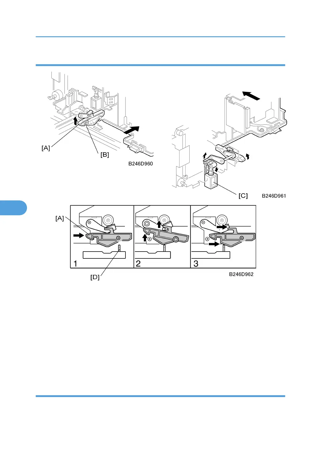 • Projection [D] pushes up lock lever [A] so that both trays separate. This makes paper loading easier.