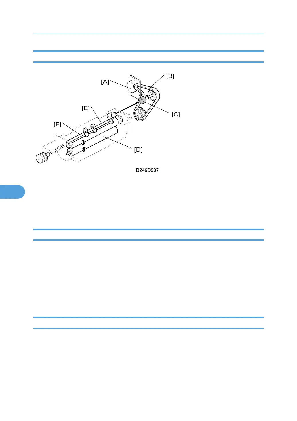 Fusing/exit motor [A] > timing belt [B] > gear coupling [C] > fusing unit