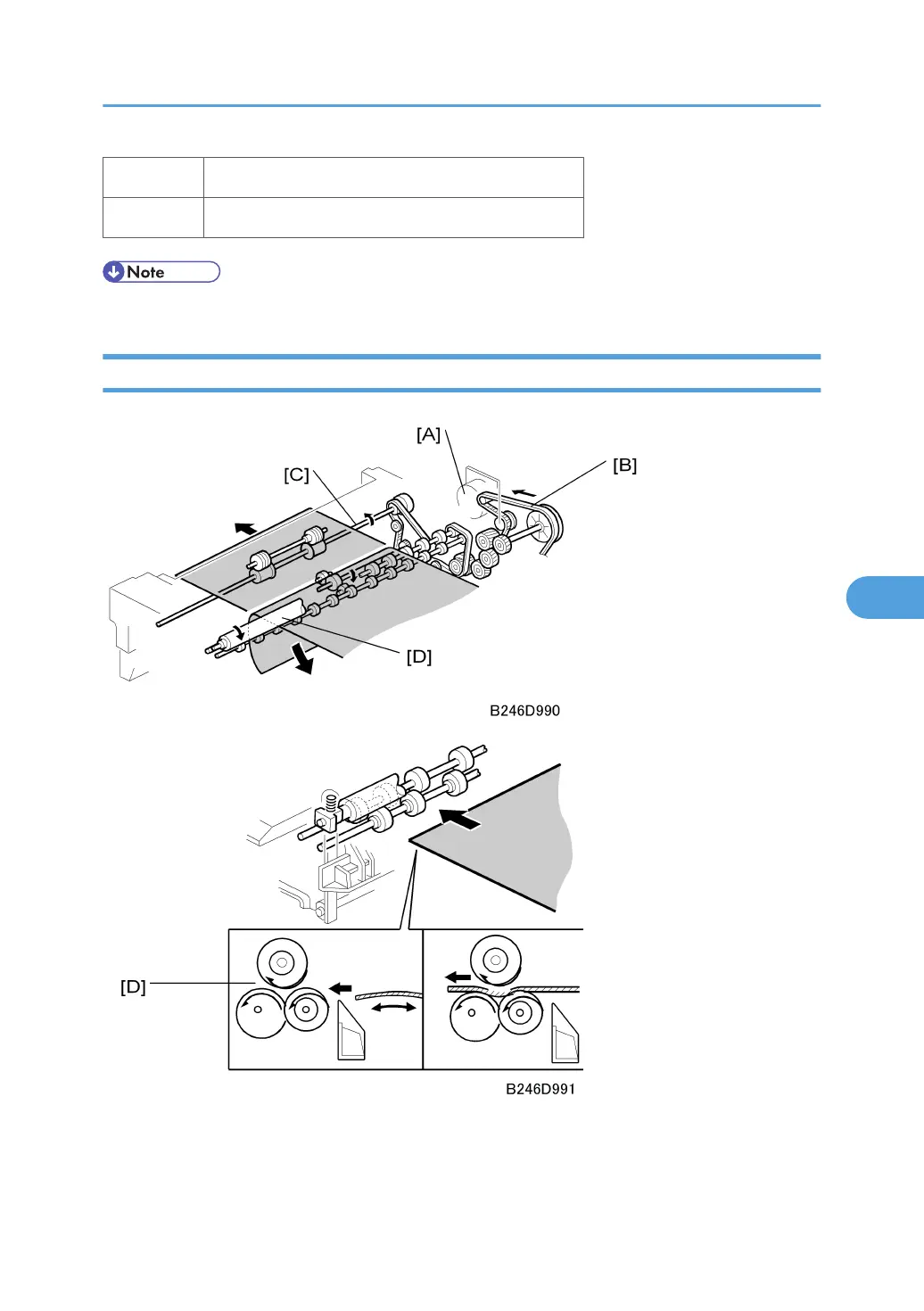 The de-curler rollers [D] remove curl from the paper before it exits. This improves feed through the duplex