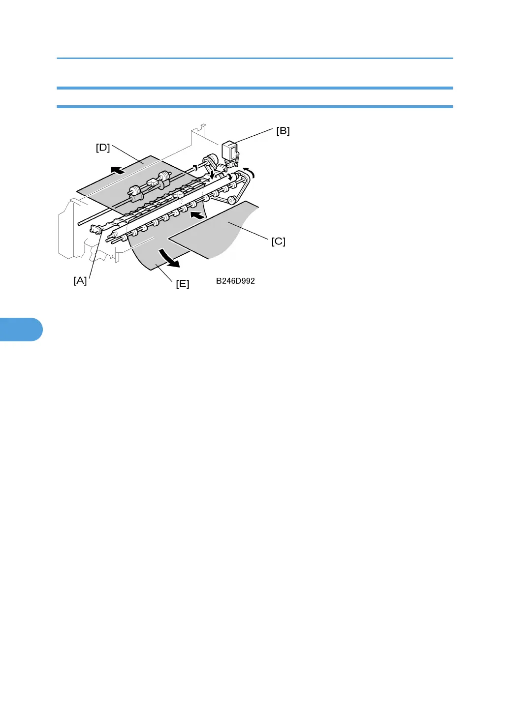 If the solenoid is on: The gate opens, and paper [C] goes straight through [D] to the output tray (for