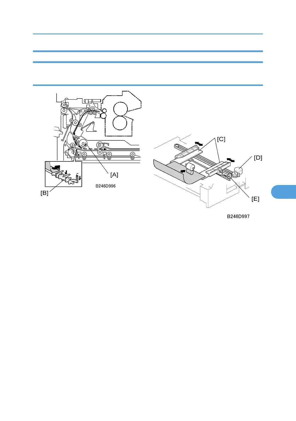 • Motor [D] positions fences [C] 20 mm away from the selected paper size to wait for the paper.