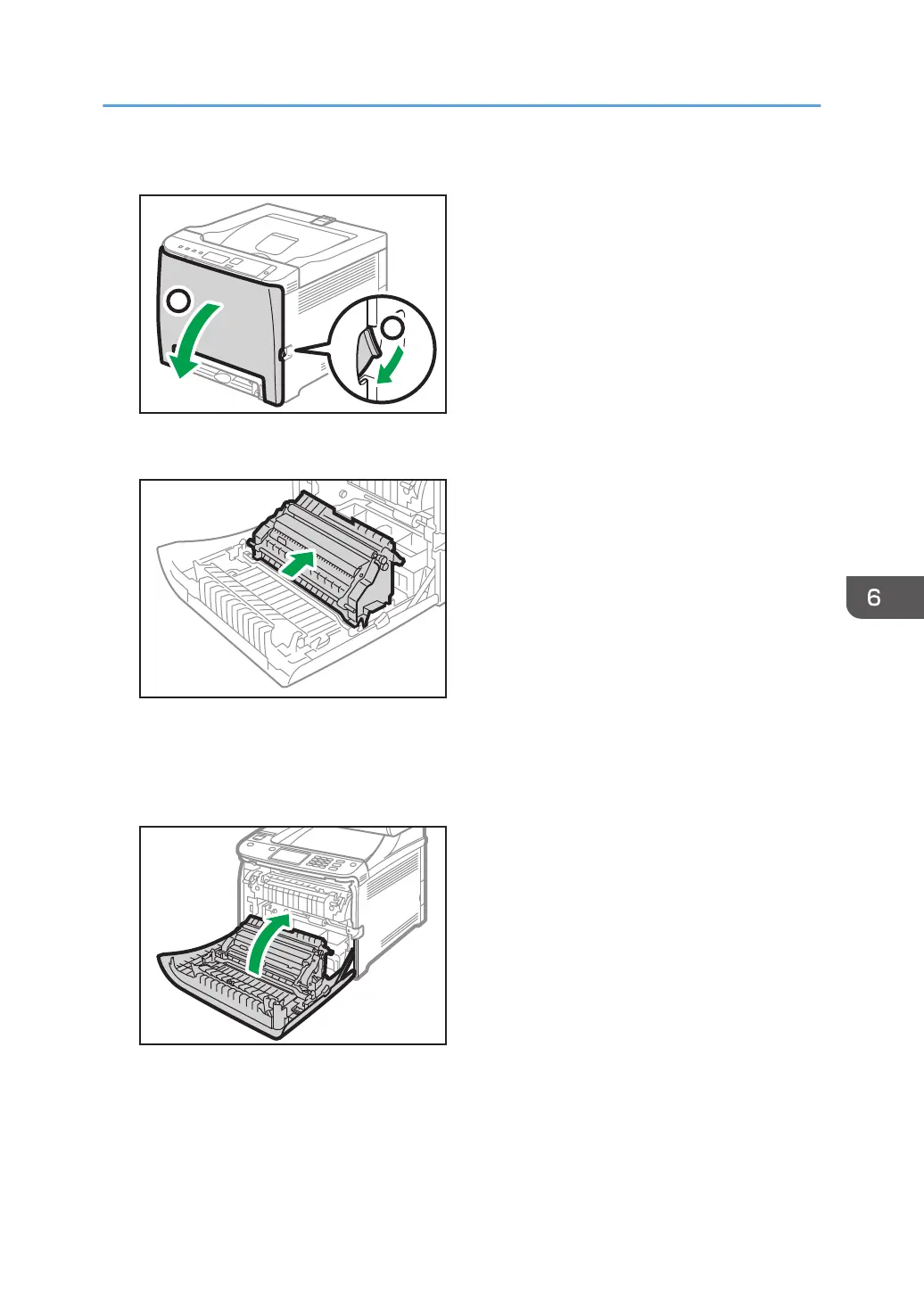 7. Pull the front cover open lever and then carefully lower the front cover.