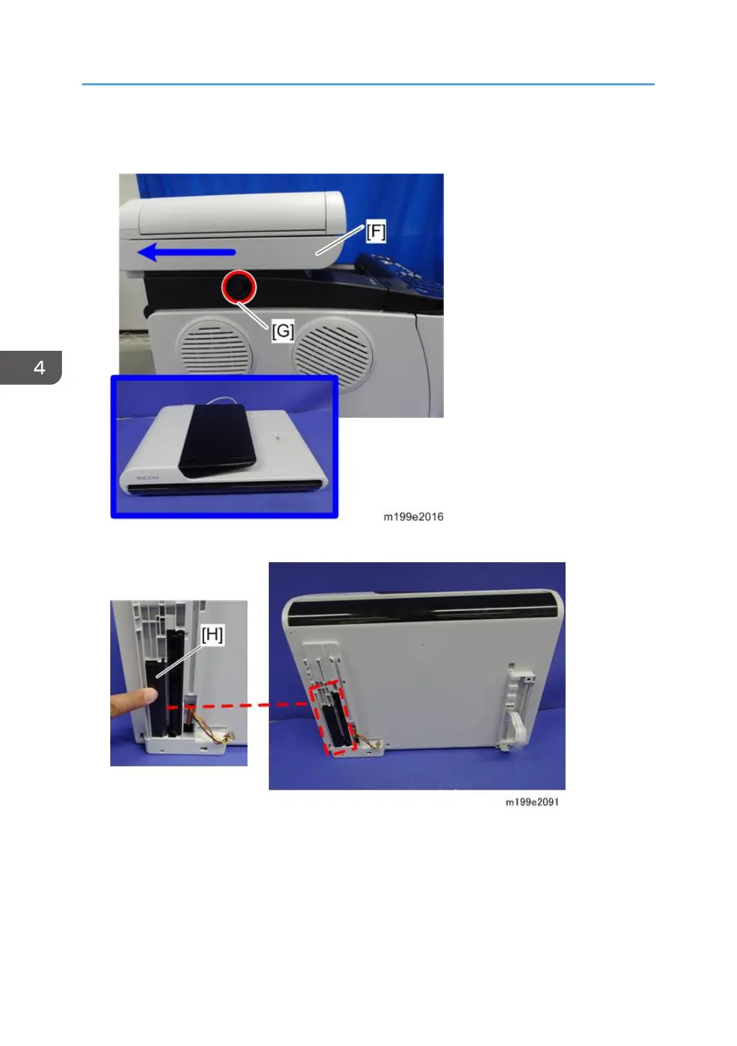 8. Slide the scanner unit [F] in the direction of the blue arrow and pull it out while pushing