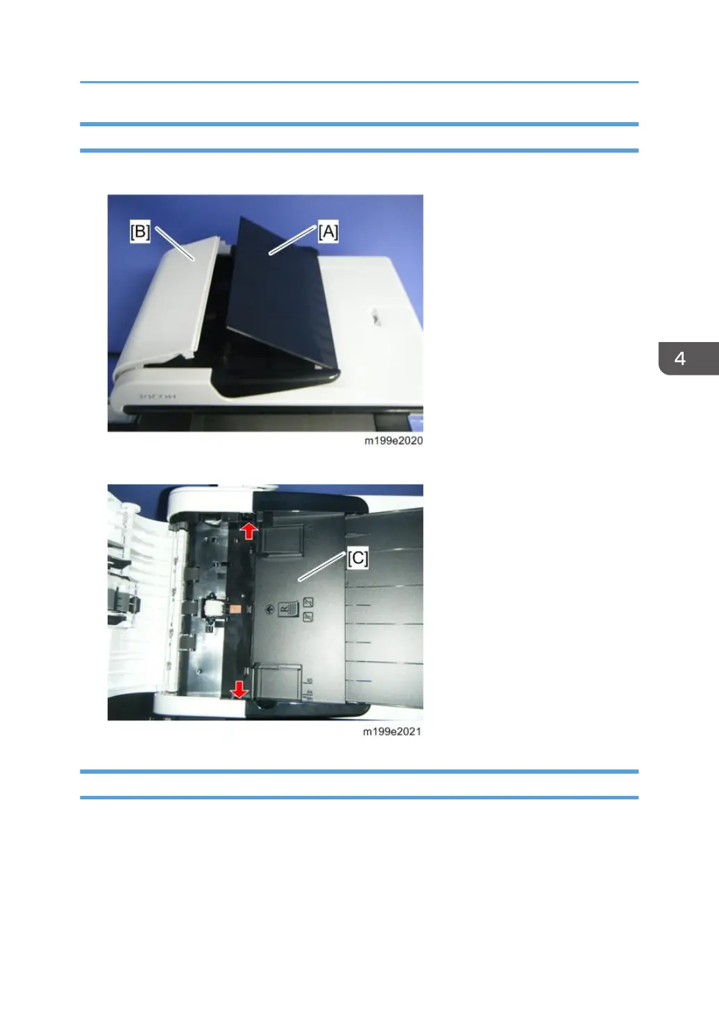 1. Open the extension tray [A] and then open the ADF top cover [B].