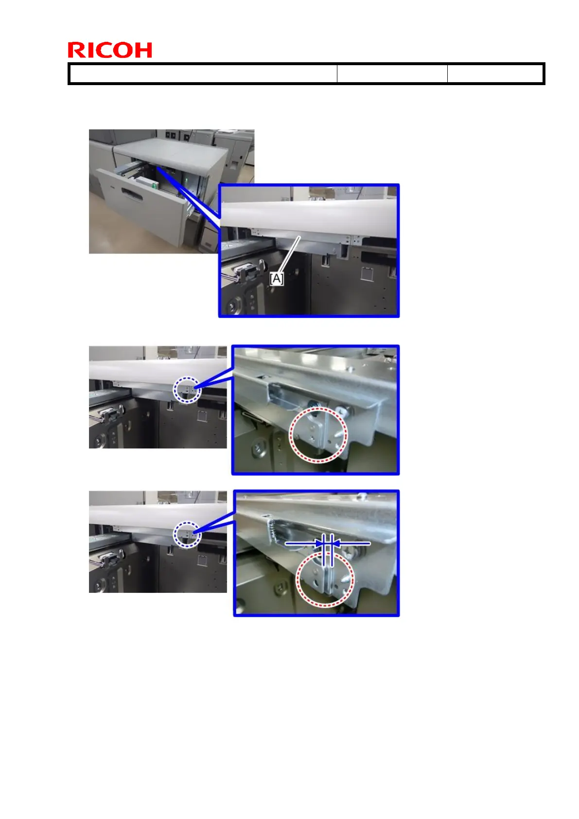 1. With the paper feed belt unit [A] installed, check if there is a gap between the frames