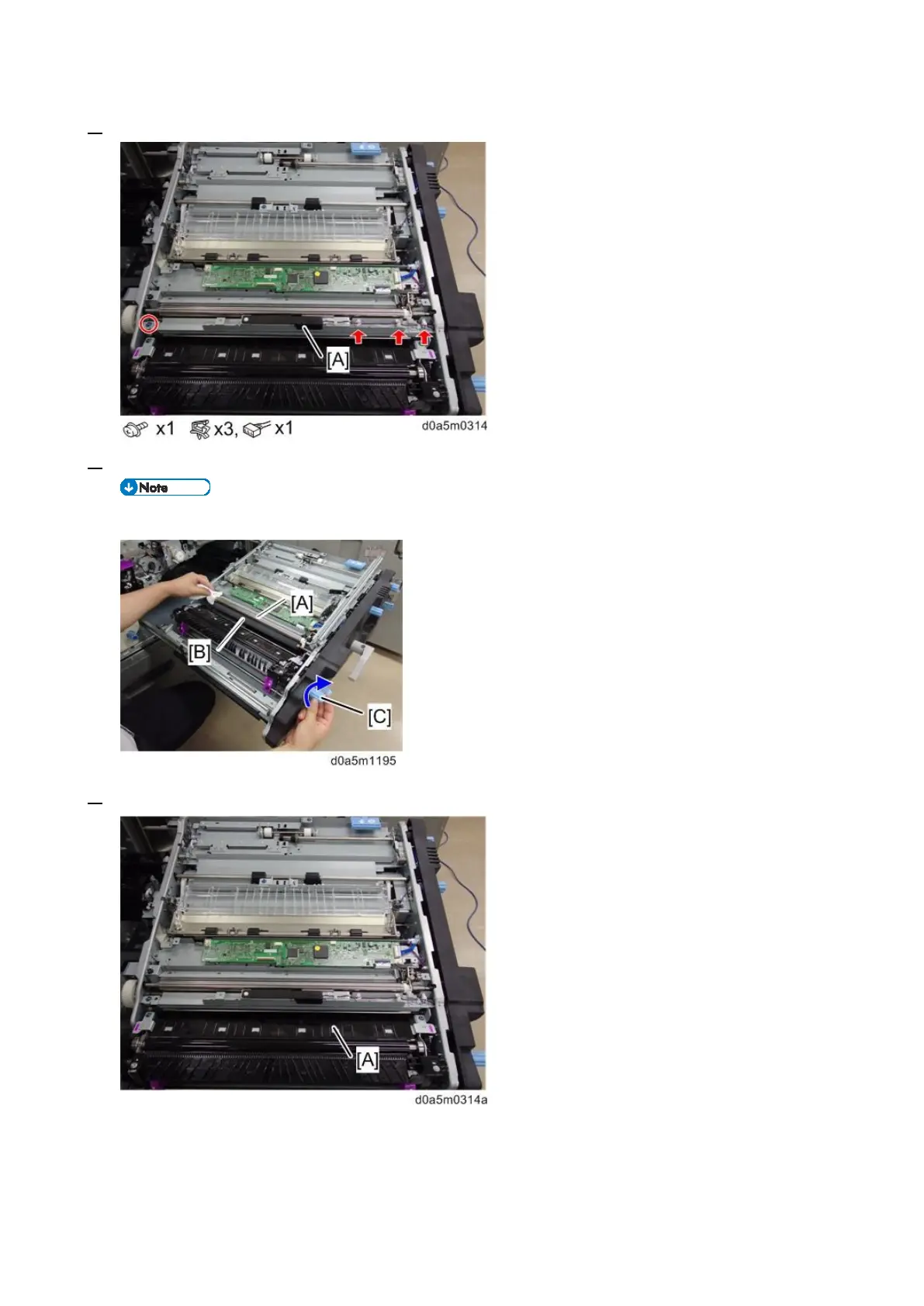 6. Clean the transfer timing idle roller [A] and transfer timing drive roller [B].