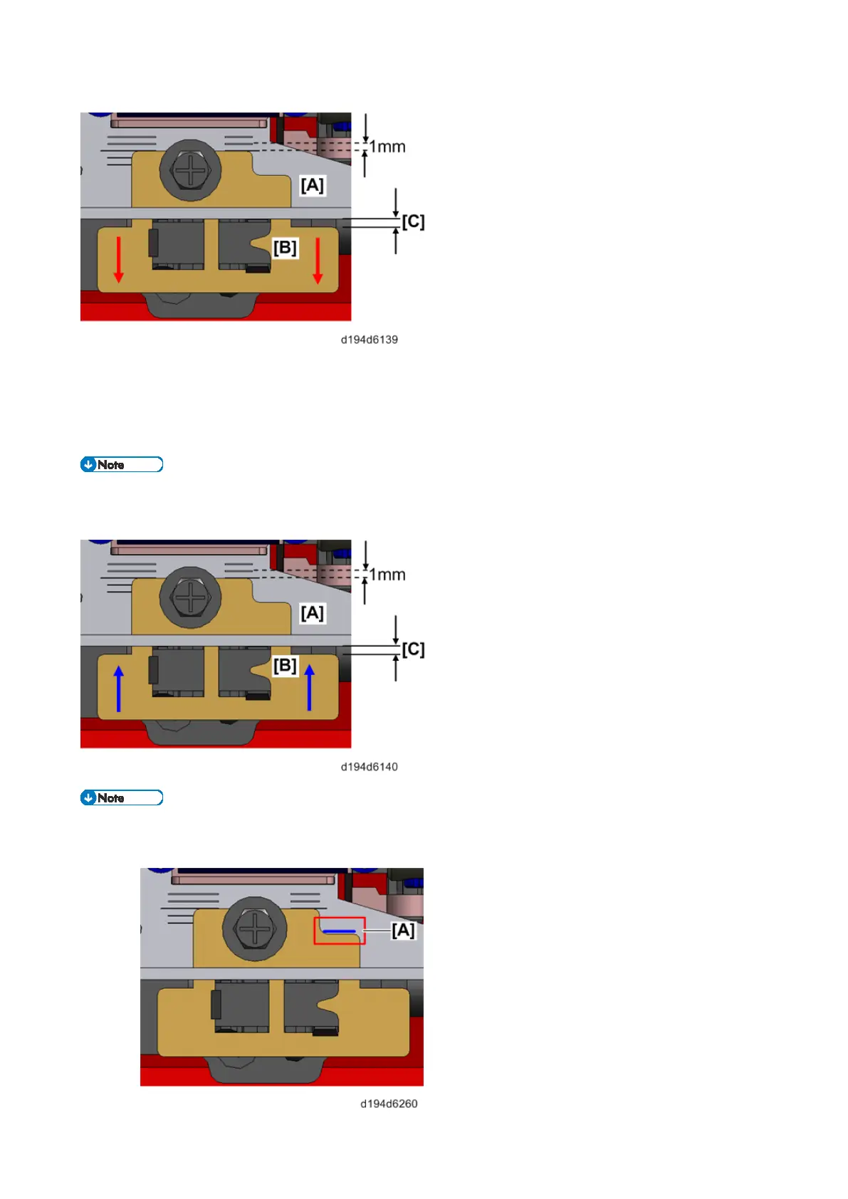 Position the paper lift sensor bracket [B] so it reduces the gap [C] on the stay [A] while keeping an eye
