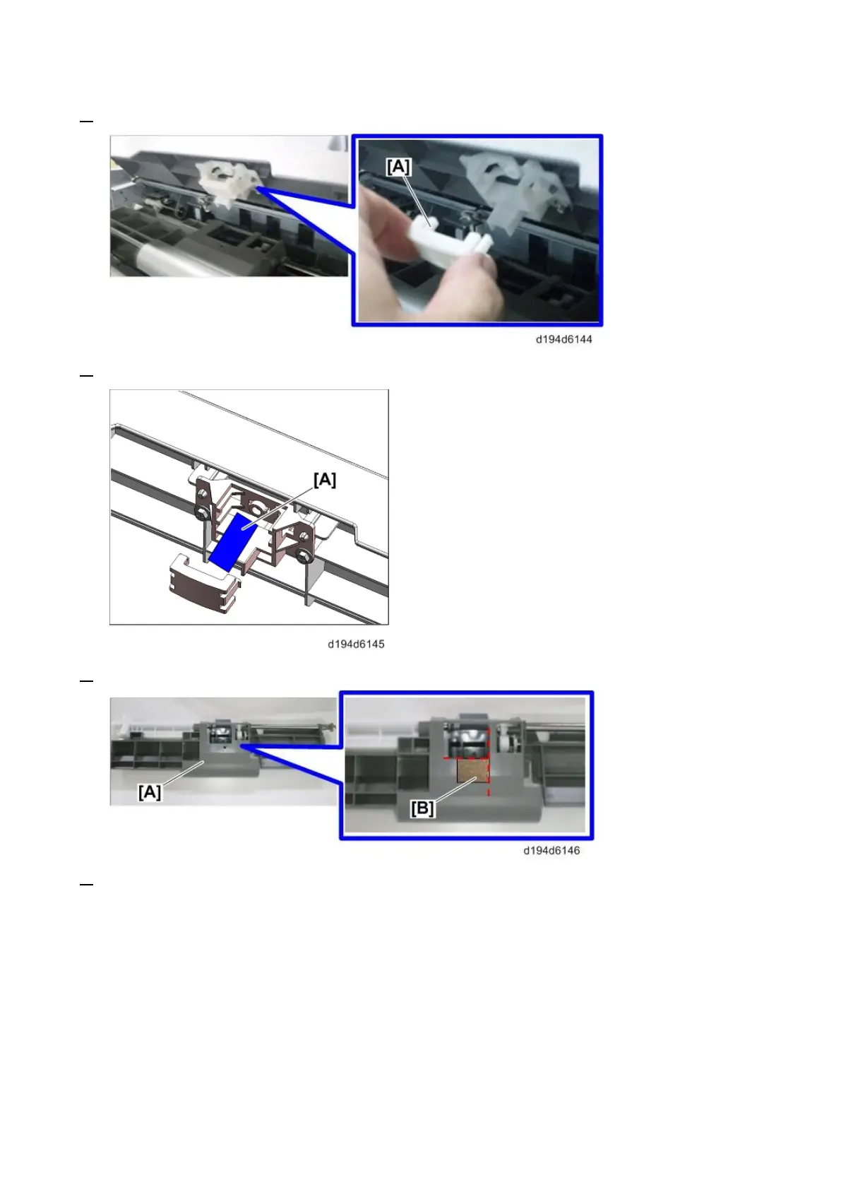 3. Remove the feed belt unit [A] and stick a friction pad [B] to the upper surface of the cover.