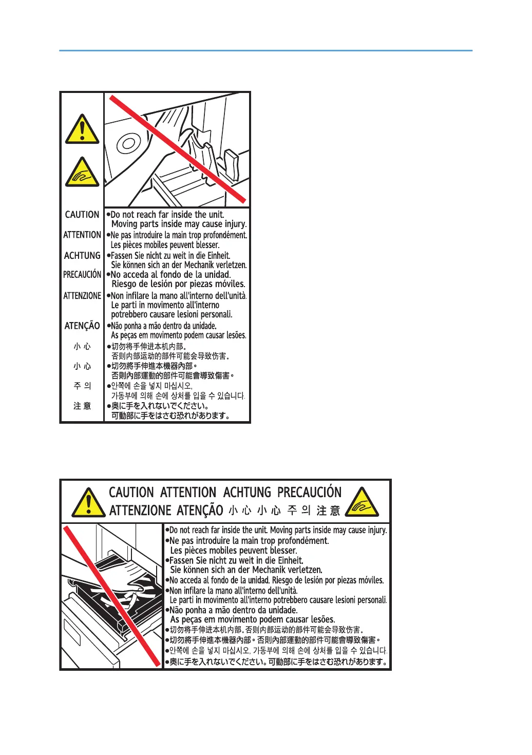 Do not reach far inside the unit. Moving parts inside may cause injury.