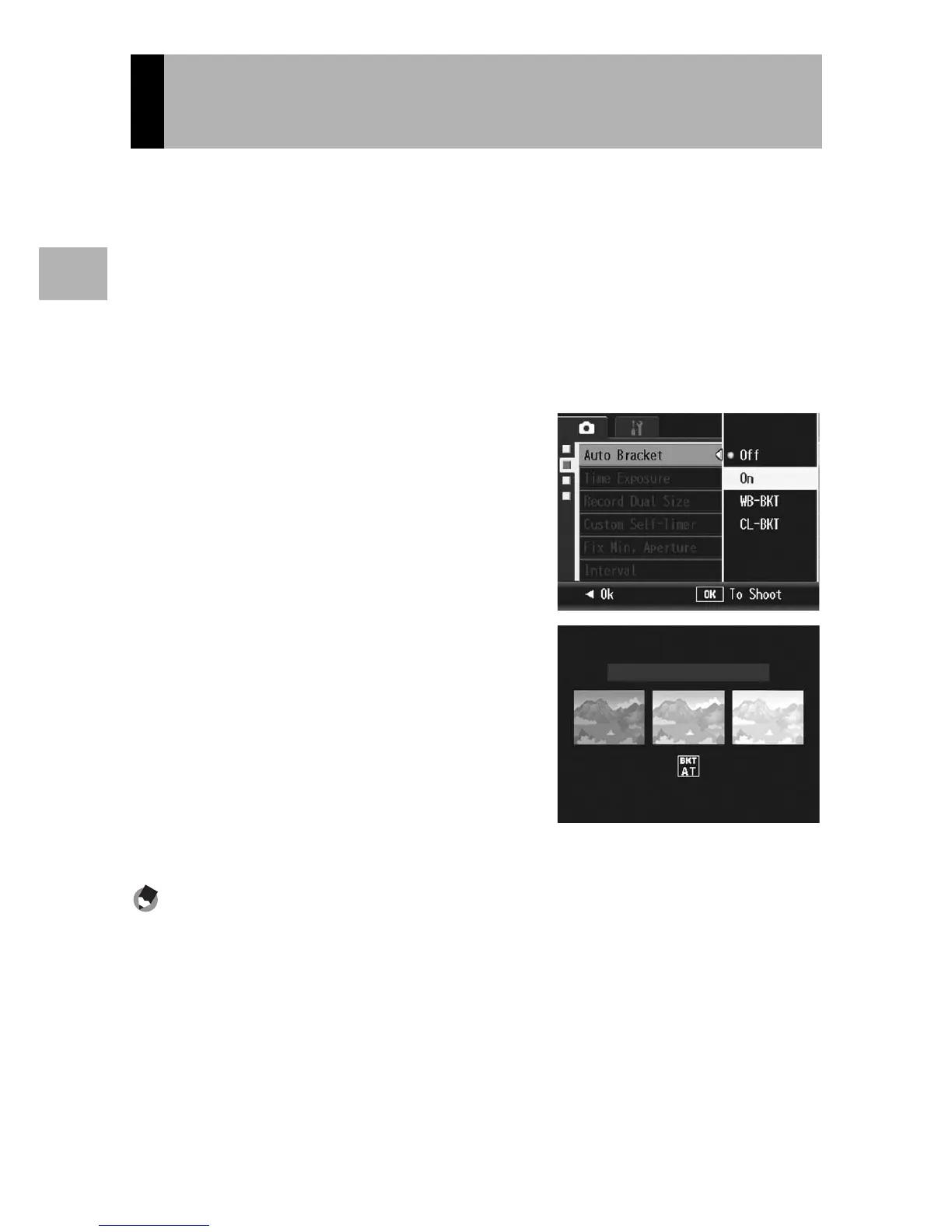 • In auto bracket mode, in addition to the exposure, the white balance or the color can