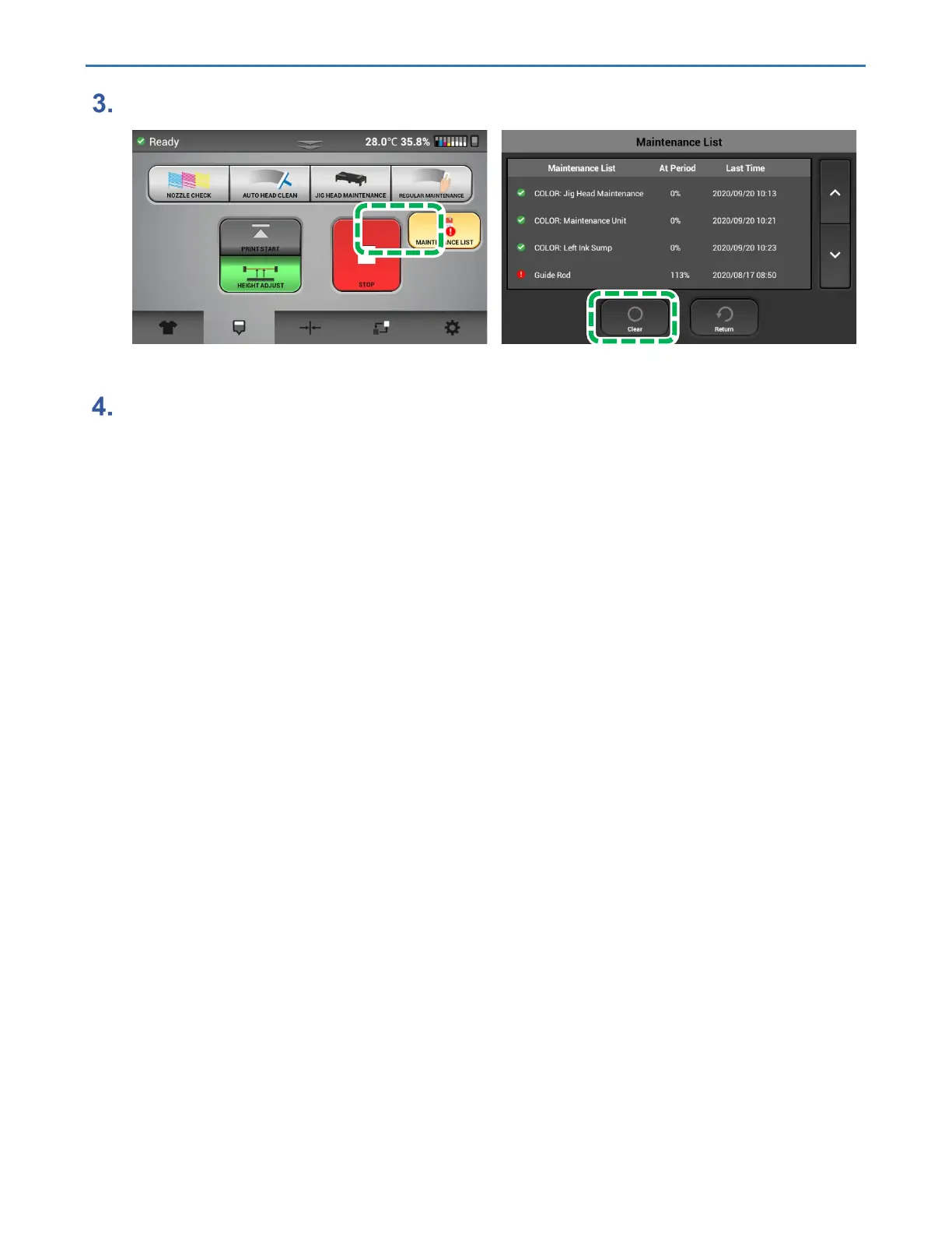 Press [MAINTENANCE LIST], Select the cleaned item, and Press [Clear].