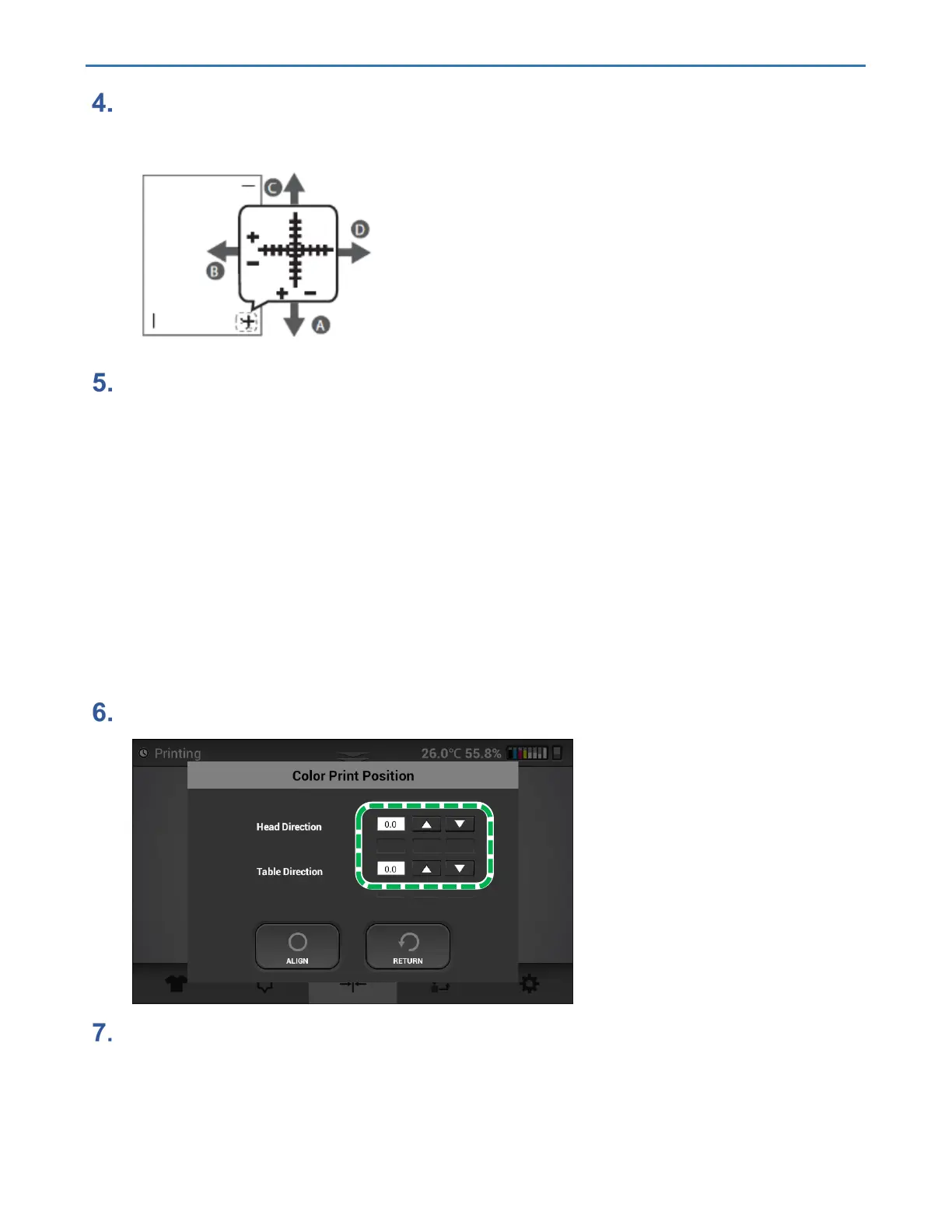 • To move the print position to the “B” direction enter a value between “+0.1” and “+5.0” in the