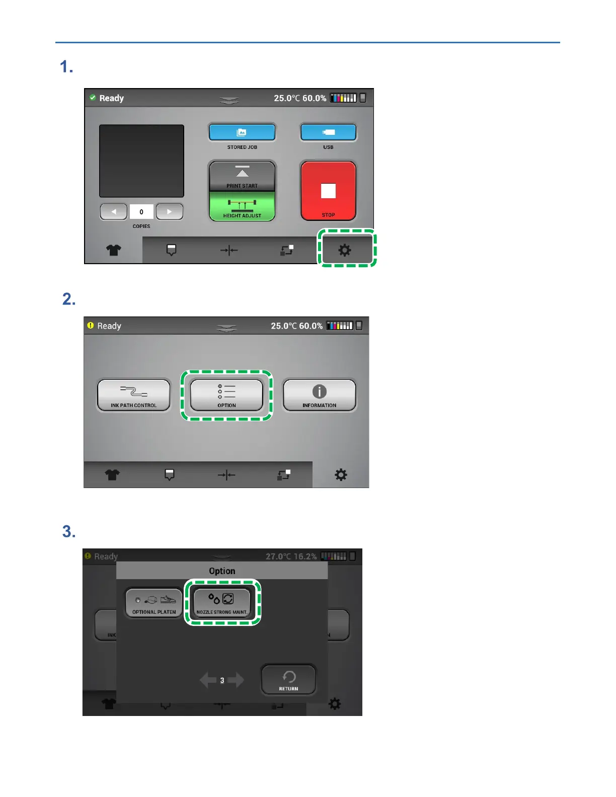 Press [NOZZLE STRONG MAINT.] on page 3 of [OPTION].