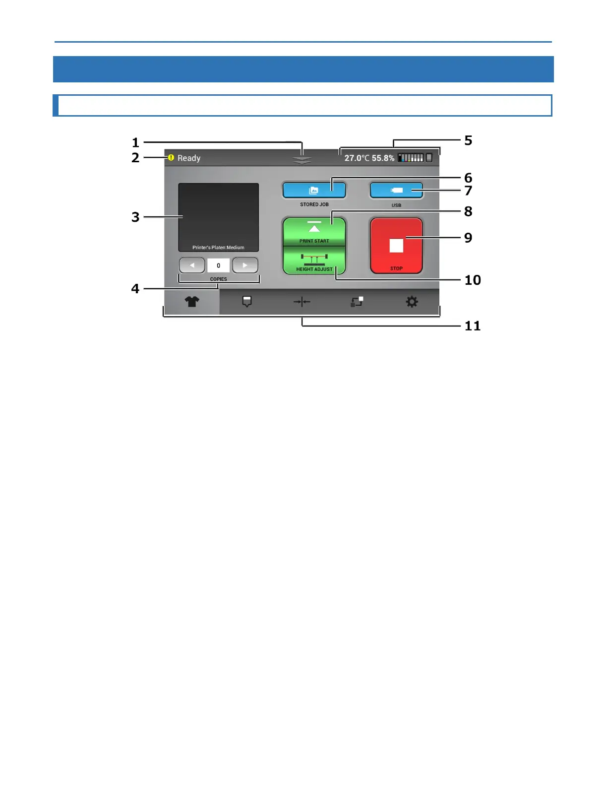 Displays the printing image preview and the selected platen type.