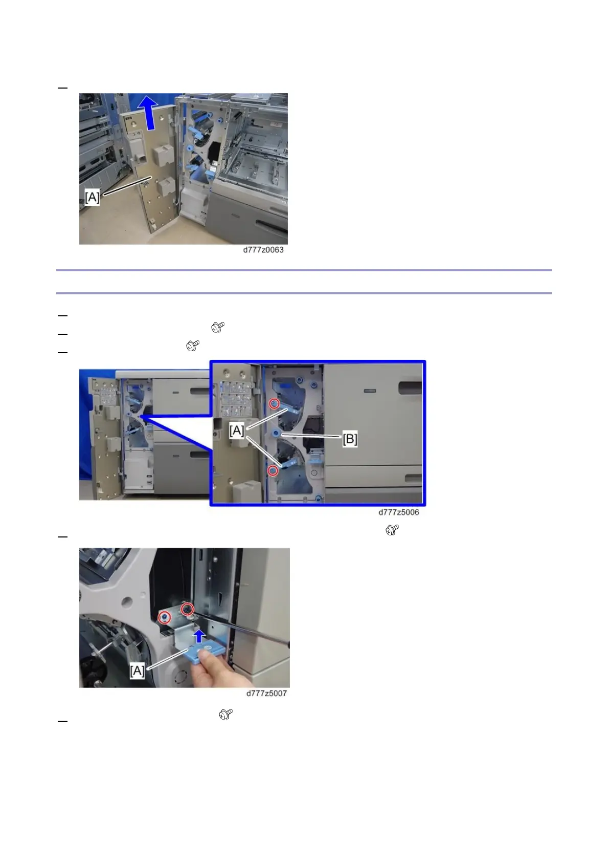 4. Raise the paper jam U9 clearing plate and remove the knob [A] ( x2).