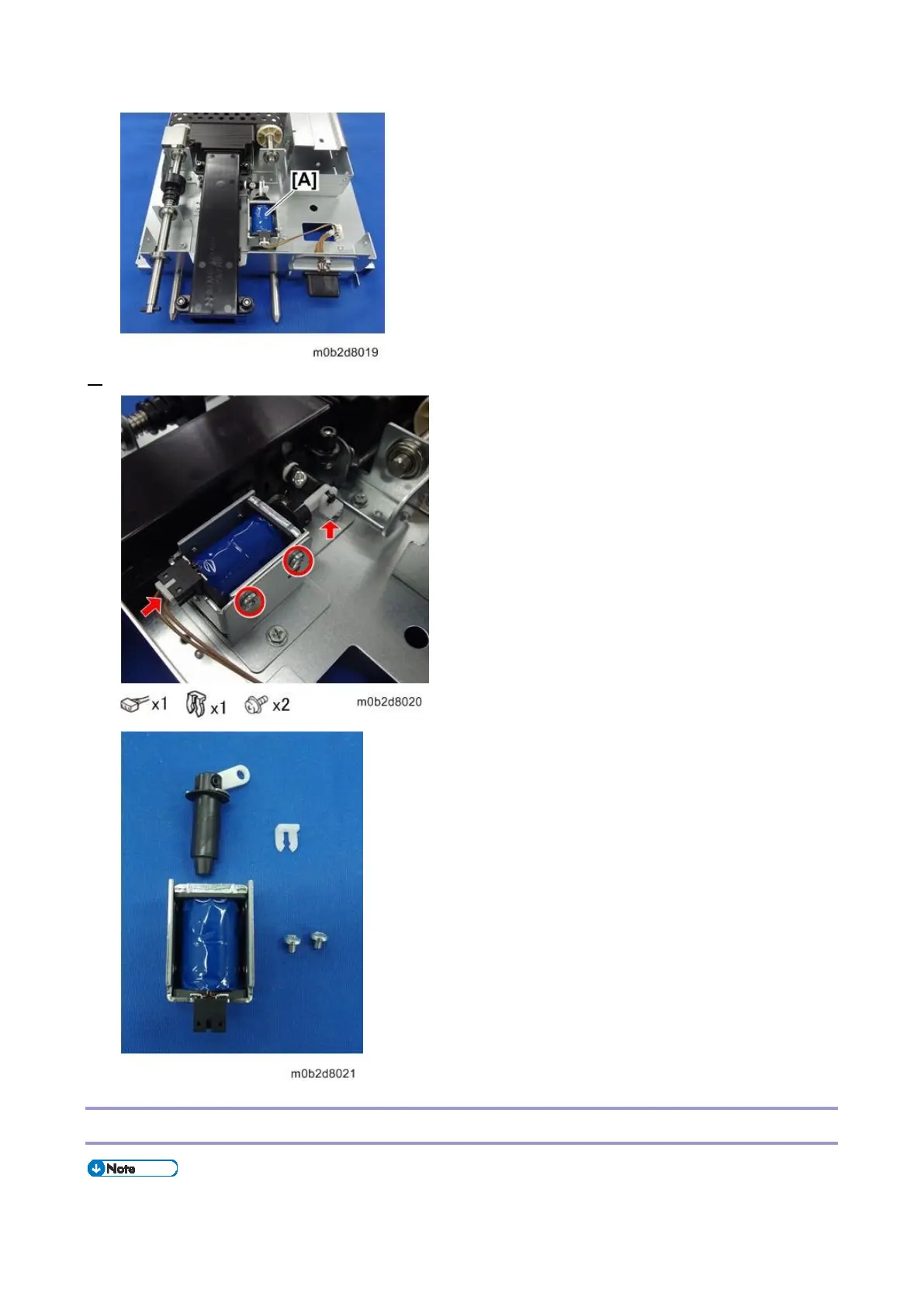 The replacement procedures for the paper feed sensor of trays 1 and 2 are the same. The